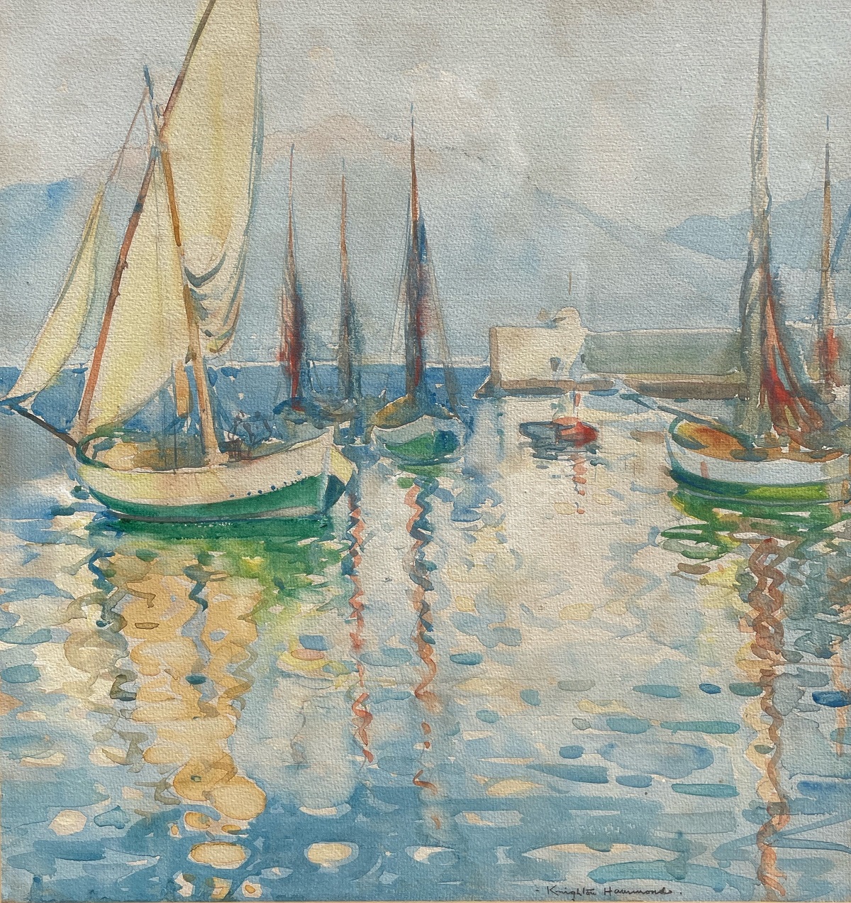 Following the divorce from his first wife, Knighton Hammond married Emmeline Low whom he had met on the Riviera. They were delighted with the birth of a baby daughter, Mary Beatrix, and during the latter part of 1926, they moved to Cap Martin. The artist was by now exhibiting regularly in England, on the Continent and further afield in America and Australia. In 1928, Knighton Hammond was elected a full Member of the American Watercolor Society. He was particularly delighted with this honour as very few English artists were members of this prestigious society.
